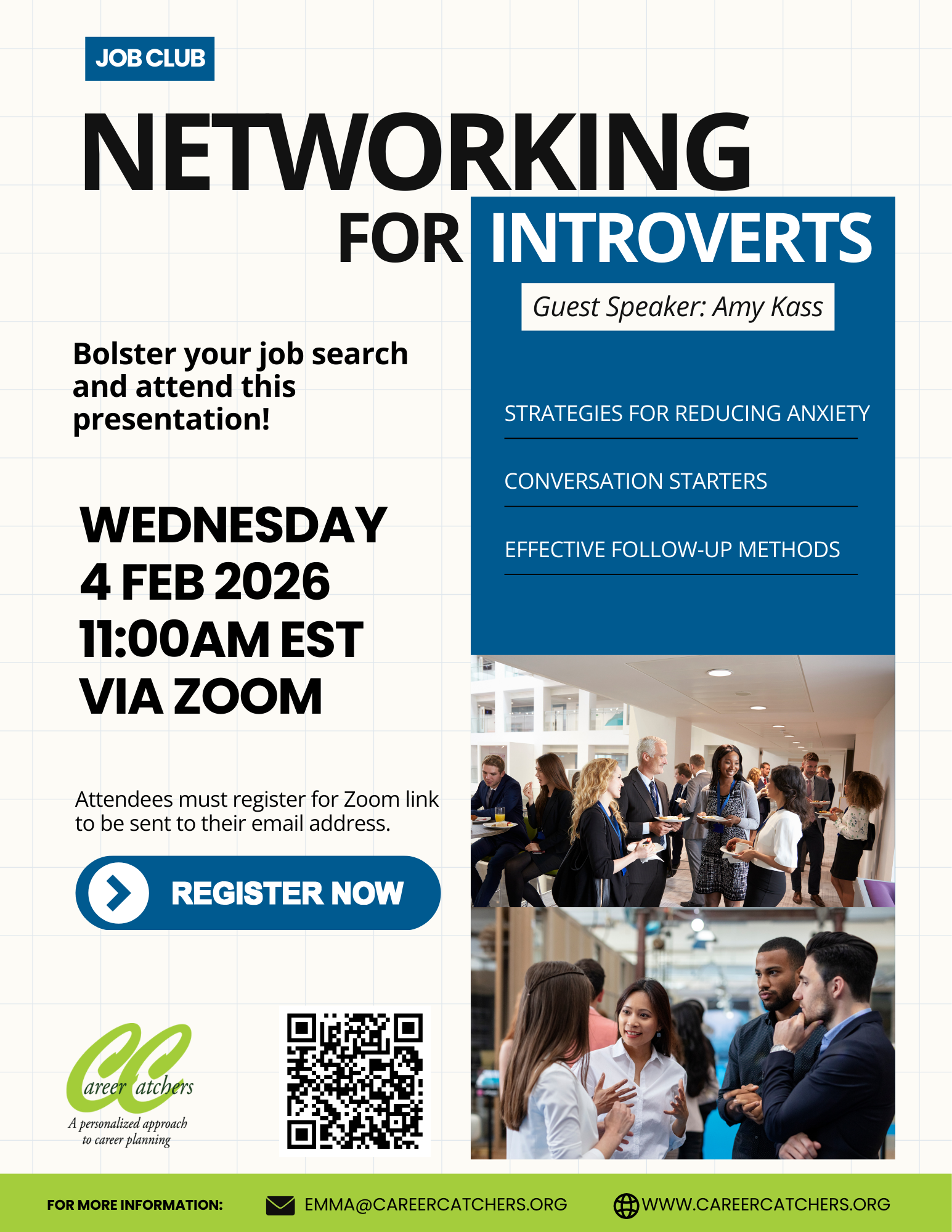 Everyone tells you it is important to network when looking for a job and throughout your working life. Does the thought of having to make glib small talk because you don’t know what to say make you anxious? You are certainly not alone. This presentation will explain how to reframe the concept of networking so it feels more natural and less transactional. Find out what traits introverts share that often prove advantageous when presented with a networking